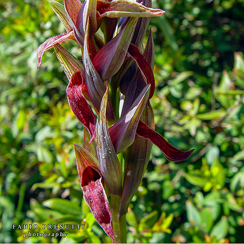 DESCRIZIONE: le Serapide della Nurra sono delle piante robuste alte all’incirca 15-35 cm, con fusto di colore verde che può presentare delle sfumature rosse-porporine verso l’alto. Foglie basali sub-erette di forma lanceolata ad apice acuto; foglie caulinari lineari-lanceolate, carenate, ad apice acuto e abbraccianti il fusto, verso l’alto man mano più ridotte. Infiorescenza densa e compatta con 3-9 fiori, muniti di brattee più brevi del casco, di colore grigio-argentee e con venature purpureo-violette. I sepali di questa specie di orchidea selvatica sono riuniti a formare un casco rigonfio rivolto verso l’alto e caratterizzati da apici acuti e colorazione grigio-argentea con evidenti venature purpureo-violette. Petali con base allargata bruno-nerastra ed apice allungato verdastro, totalmente inclusi dentro il casco. Labello bipartito, ipochilo con lobi laterali rosso-porporini rialzati ed eretti, quasi totalmente inclusi nel casco. Callosità lamellari un po’ arcuate e di colore purpureo-nearstre. Epichilo lanceolato-acuminato, ripiegato verso il basso e bicolore, bruno-rossiccio nella parte centrale e con banda bianco-grigiastra lungo il margine (epichilo pallido-marginato). Pelosità rossiccia concentrata nella piegatura ipochilo-epichilo, dove si osserva anche una caratteristica smarginatura. Ginostemio rosso-violaceo ad apice acuto.
